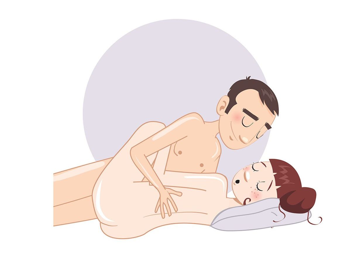 Mann und Frau liegen auf der Seite, die Gesichter einander zugewandt. Sie zieht die Knie an und umklammert ihn mit ihren Beinen.