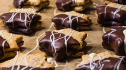 Noch kurz in geschmolzene Schokolade eingetaucht und mit Nüssen verziert – schon sind die selbstgemachten Doppeldecker-Kekse fertig und lassen die Herzen von Plätzchen-Fans höherschlagen.