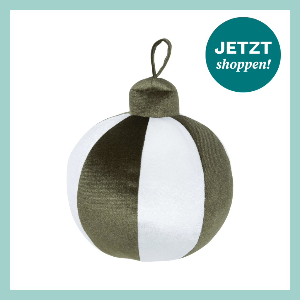 Origineller geht’s nicht! Dieses gefüllte Kissen aus zweifarbigem Samt* sieht aus wie eine übergroße Weihnachtskugel, wie wir sie sonst nur an den Weihnachtsbaum hängen.