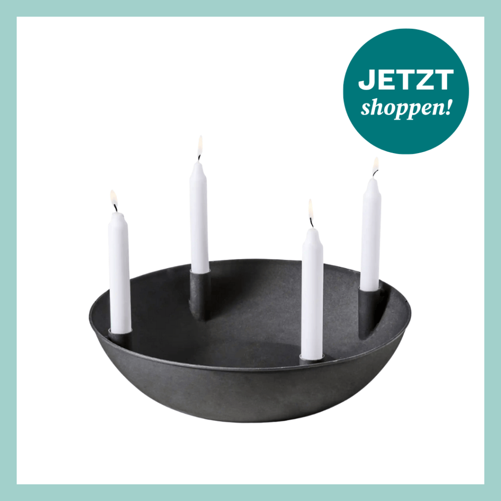 Bei all der Weihnachtsdeko darf natürlich der Adventskranz nicht vergessen werden! Dieser schlichte Kerzenständer* kann ganz individuell dekoriert werden, zum Beispiel mit Tannenzweigen oder Weihnachtskugeln. Wer es lieber minimalistisch mag, kann sich auch einfach für ein paar besondere Stabkerzen (wie diese gedrehten Kerzen von Bonprix*) entscheiden.
