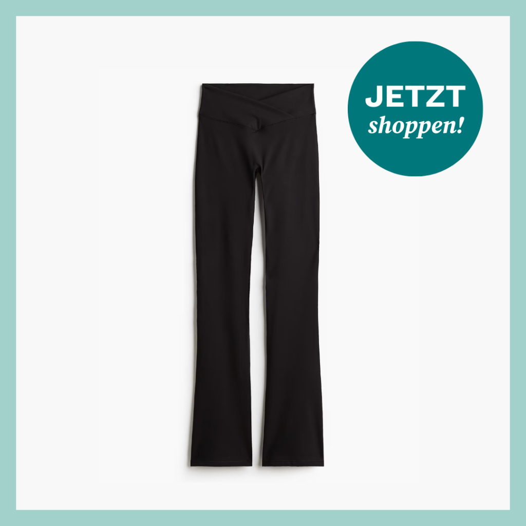 <p>Dank des weichen Stoffes sitzt sie locker leicht, wie eine zweite Haut. Der hohe Bund in V-Form sorgt außerdem für eine tolle Silhouette. Die flared Leggings bekommt ihr bei H&;M in den Farben schwarz und dunkelblau und in den Größen XS – XXL für nur <strong>34,99 Euro</strong>.</p>