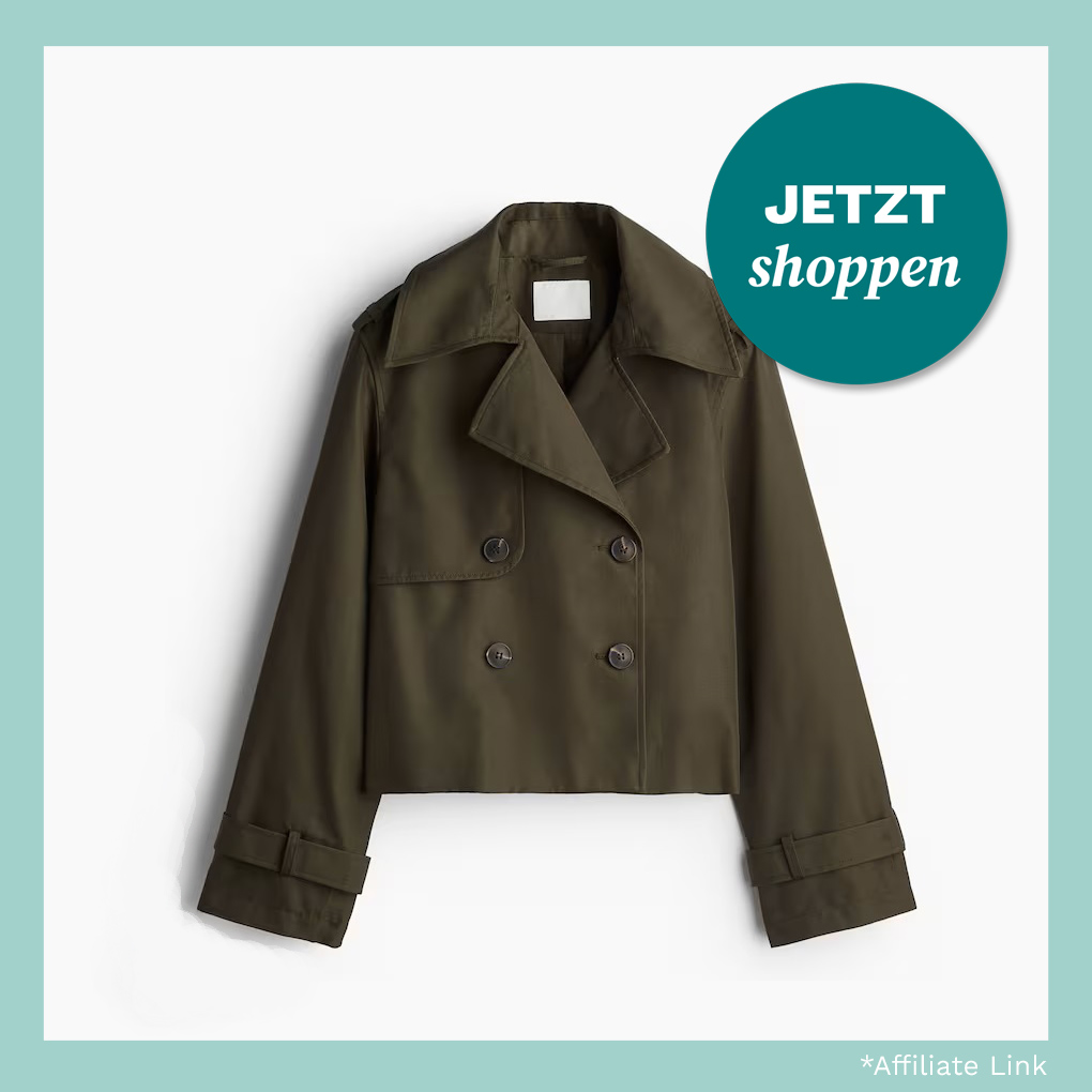 Der gekürzte Trenchcoat von H&M* eignet bestens für alle sonnigeren Herbsttage, an denen es nicht zu kalt und nicht zu warm ist. Im Gegensatz zu einer längeren Variante bietet dir die Mini-Version mehr Bewegungsfreiheit. Außerdem bleiben Teile deines Outfits sichtbar. So werden Hose, Rock, Kleid oder Shorts nicht komplett vom Stoff verdeckt, sondern bilden gemeinsam mit der Jacke einen Gesamt-Look.