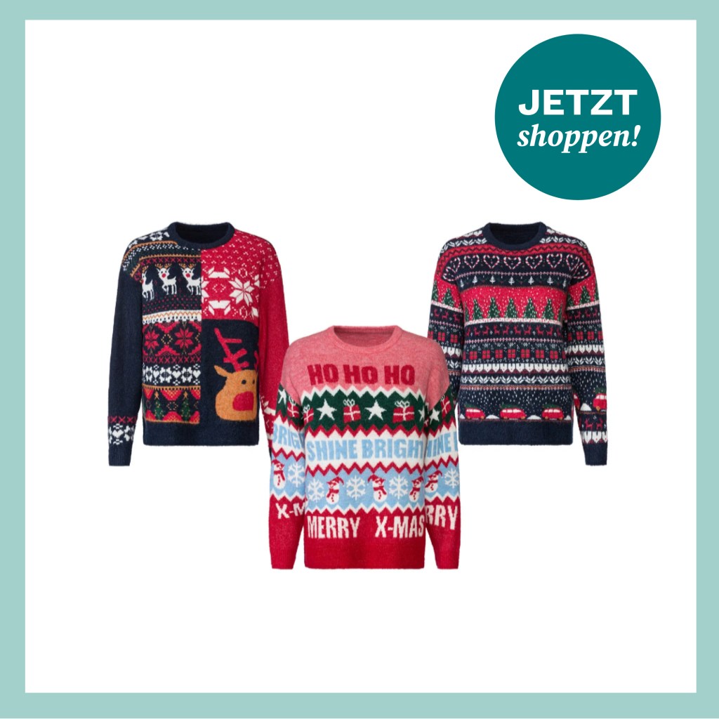 Die kitschigen Sweater gibt es momentan für nur 8,99 € und in einer großen Auswahl. Neben klassischen Rentier-Motiven sind wir total begeistert von den bunten Modellen mit kleinen Geschenken, Schneemännern und Schneeflocken.