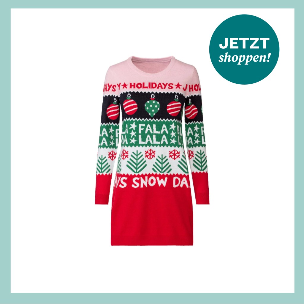 Steht ihr nicht so auf Pullis, sondern tragt ihr lieber Kleider? Auch das ist kein Problem. Denn Lidl bietet ebenso einige Ugly Christmas Dresses* an. Die Kleider sind an Weihnachten ein echter Hingucker, denn es gibt sie in drei unterschiedlichen Designs: mit weihnachtlichem Schriftzug und Christbaumkugeln, ein klassisches Lebkuchen-Design oder mit einem süßen Rentier-Emblem.