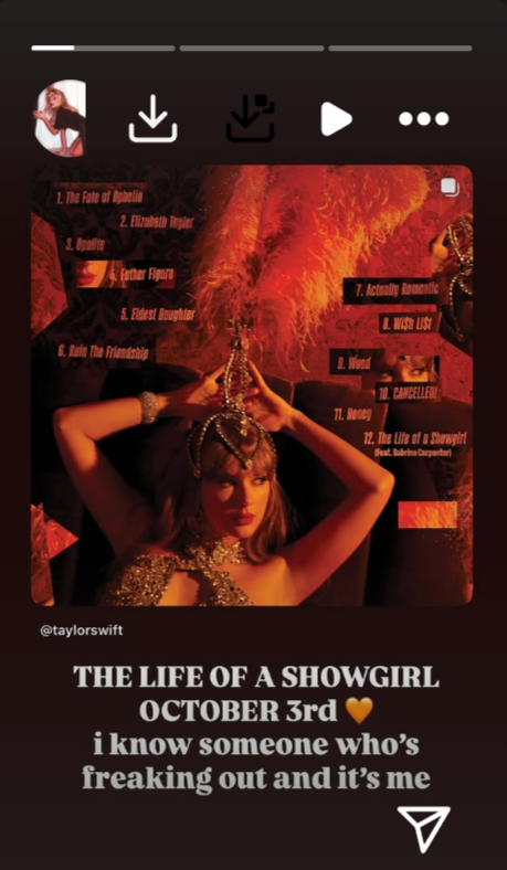 Sie ist auf dem Titeltrack von Taylor Swifts neuem Album „Life of a Showgirl“ zu hören: Sabrina Carpenter lebt gerade ihren größten Traum – und flippt auf Instagram völlig aus.
