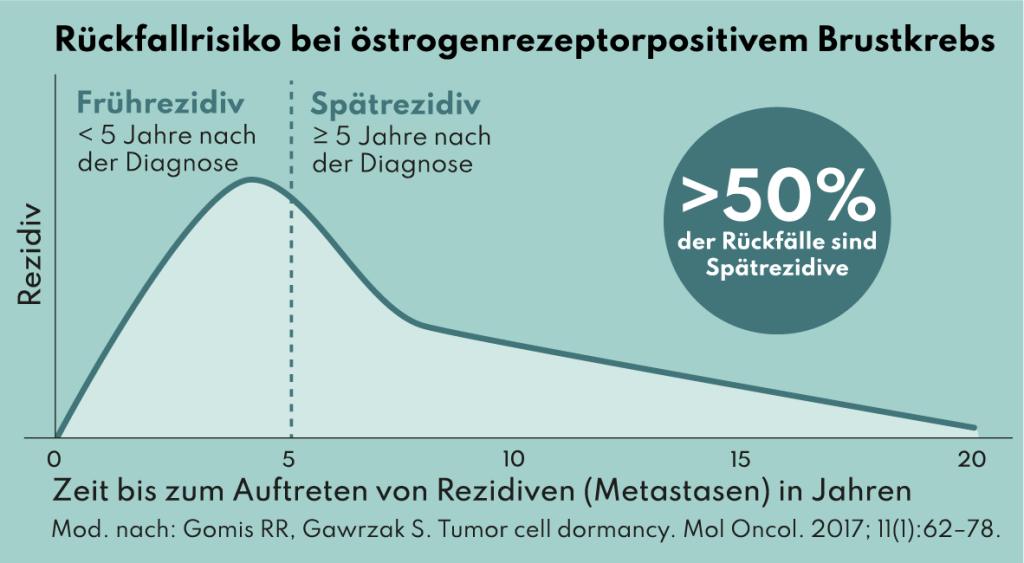 Das individuelle Rückfallrisiko hängt von verschiedenen Faktoren wie z. B. dem Tumorstadium ab. Etwa ein Drittel der Patientinnen mit HR+ Brustkrebs im Stadium II erleidet innerhalb von 20 Jahren einen Rückfall. Die Hälfte der Rückfälle treten dabei erst nach über fünf Jahren nach der Diagnose auf.