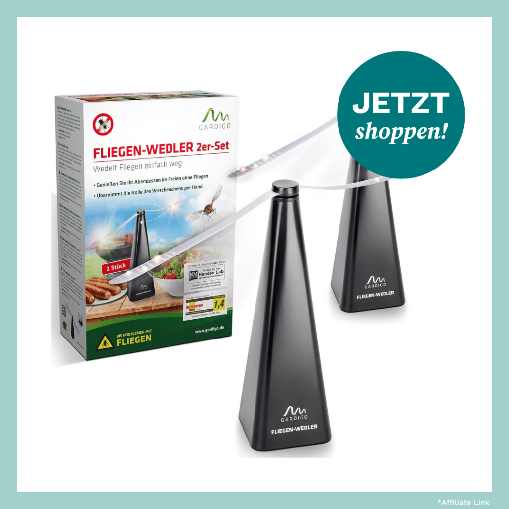 Mein persönlicher Liebling: ein Fliegenventilator von Amazon*. Diese kleinen Geräte stehen auf dem Tisch und sorgen mit leise rotierenden Flügeln dafür, dass Fliegen und Wespen fernbleiben. Die reflektierenden Streifen an den Flügeln schrecken die Insekten zuverlässig ab. Verletzungsgefahr besteht übriges nicht: Die Flügel bestehen aus extra weichem Kunststoff und stoppen sofort, sobald sie berührt werden.