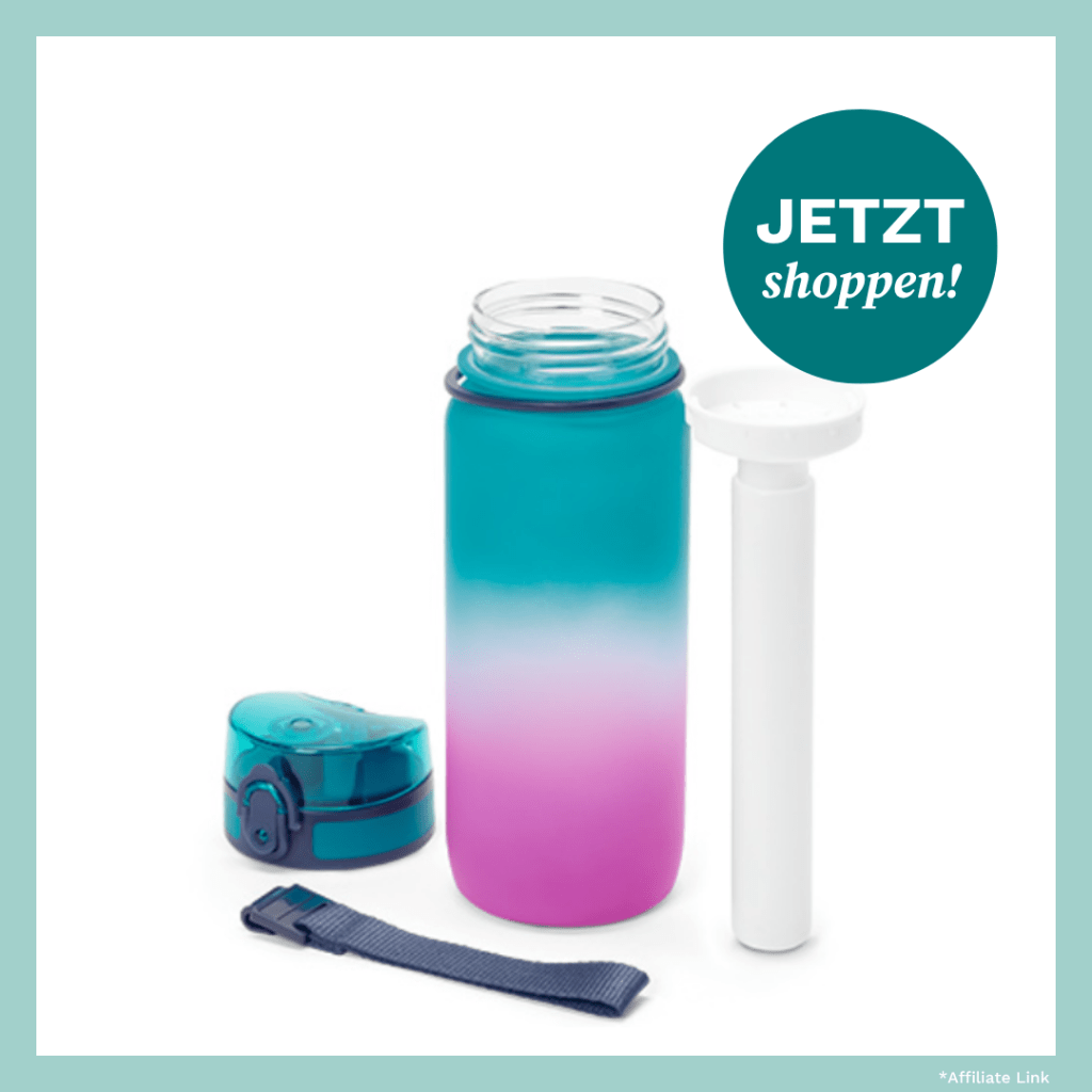 Wollt ihr die Kühlflasche* ohne Kühlakku benutzen, ist das auch kein Problem. Der Akkustab ist herausnehmbar und die Flasche lässt sich trotzdem ganz einfach schließen. Außerdem sorgt der Klickverschluss- Deckel dafür, dass die Flasche auslaufsicher ist. Und das Gute daran: Die Flasche kostet lediglich 12,99 €.